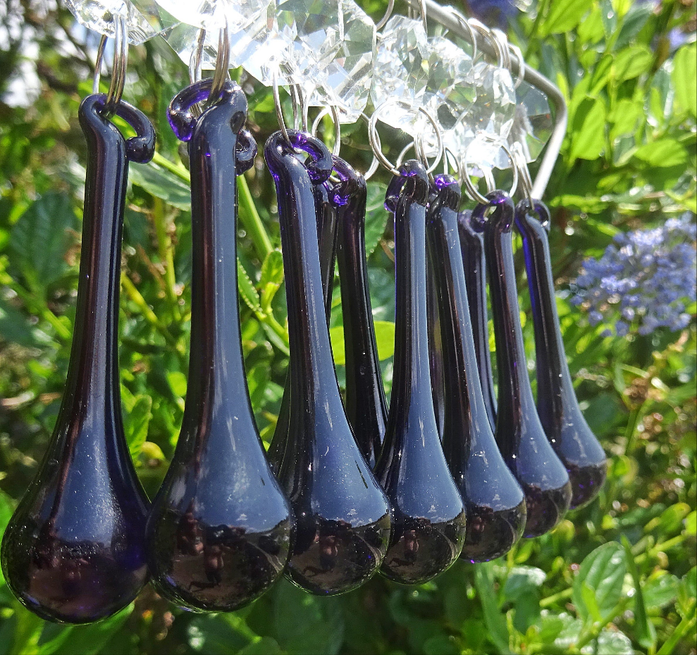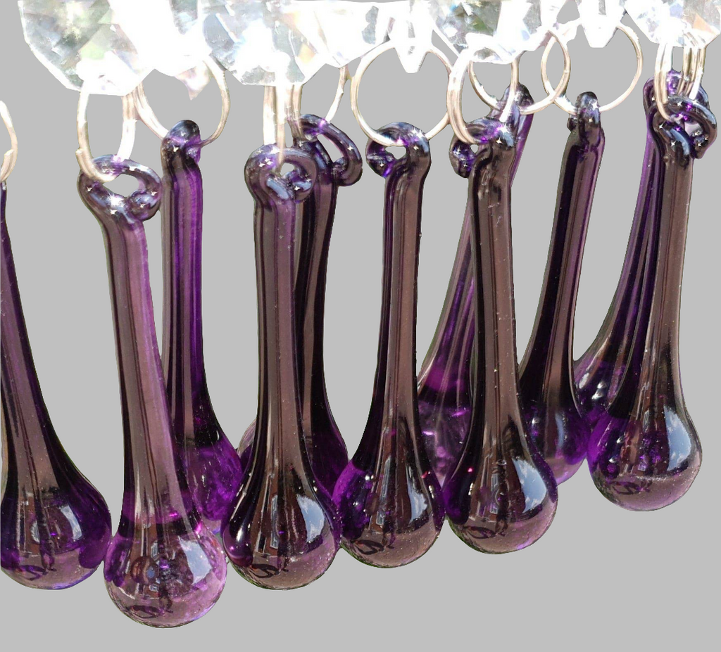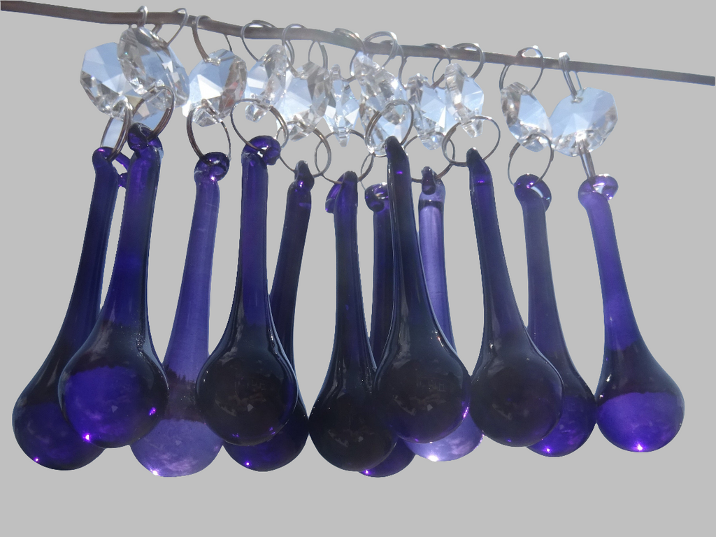 This lot comprises of 12 chandelier droplet chains. Each chain consists of a 14 mm octagonal clear glass droplet connected to a 53 mm purple tear drop orb shaped droplet: total hanging depth of 71 mm.