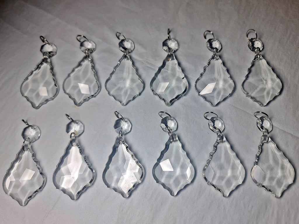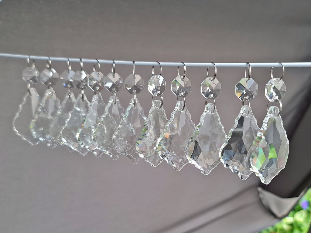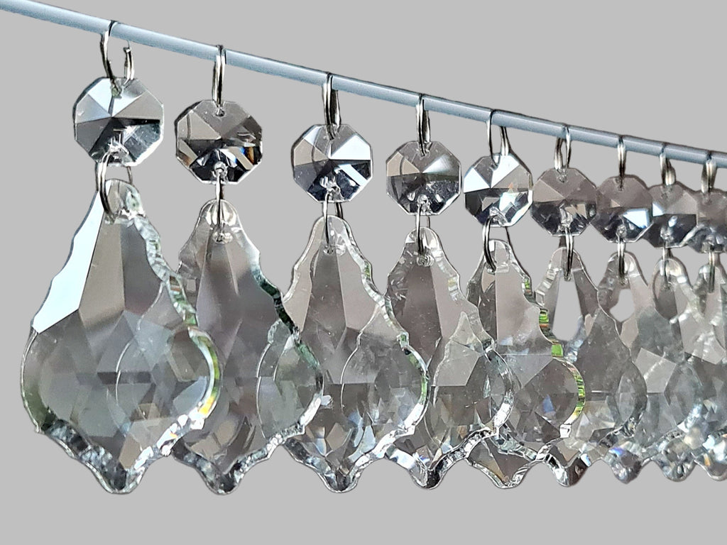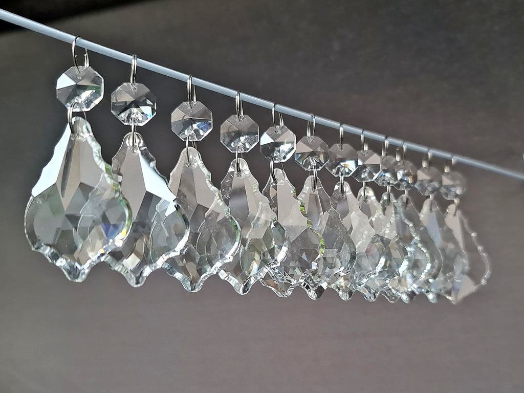 12 clear cut glass chandelier droplet chains. Each leaf pendant consists of a 14 mm octagonal glass droplet connected to a 50 mm (2 inch) x 32 mm (1.3 inch) leaf shaped droplet: total hanging depth of 68 mm. The leaf droplet has facet detailing to the front of the droplet, is flat to the under side and features bevelled edge detailing.